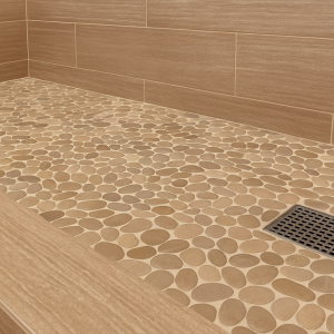 If you love a seamless, modern look, swap out pebbles for smaller porcelain or ceramic tiles in neutral tones. You can get the same finish or color as your wall tile, but in a smaller size. They offer a clean aesthetic and provide some slip‑resistance, so you’ll still get plenty of traction. Alternately you can use a pre-made one piece shower pan by Jacuzzi or other manufacturers.